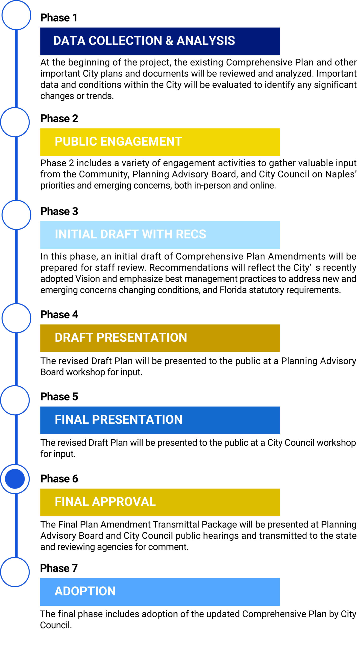 The City of Naples Comprehensive Plan Amendment project, Naples2045, is anticipated to be a 22-month planning process beginning in March 2025, and concluding with adoption by City Council and transmittal to the relevant state agencies for review in Fall 2026. There are seven phases to the project, which include substantial community outreach and engagement. A variety of opportunities will be available for the public to participate in the planning process, including in-person and virtual engagement, public workshops and hearings, as well as surveys, questionnaires, and commentary on draft documents.